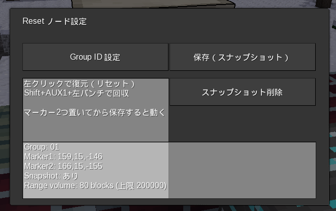 - 範囲にノード1とノード2を設置してリセットマーカーで保存(スナップショット)